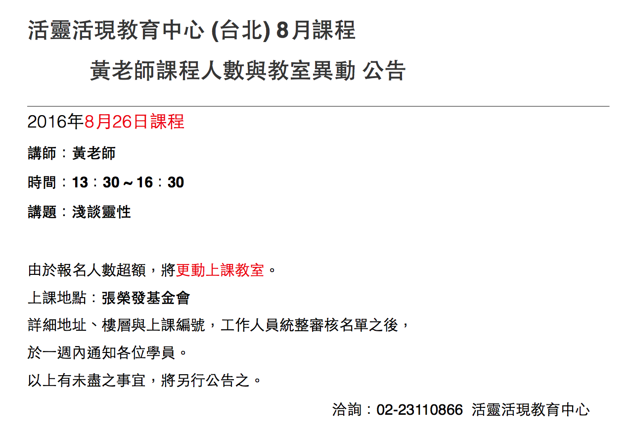 靈界核准本處租用張榮發基金會容納228人的大教室.所有候補的朋友都可以上課.並於明天開始通知大家.